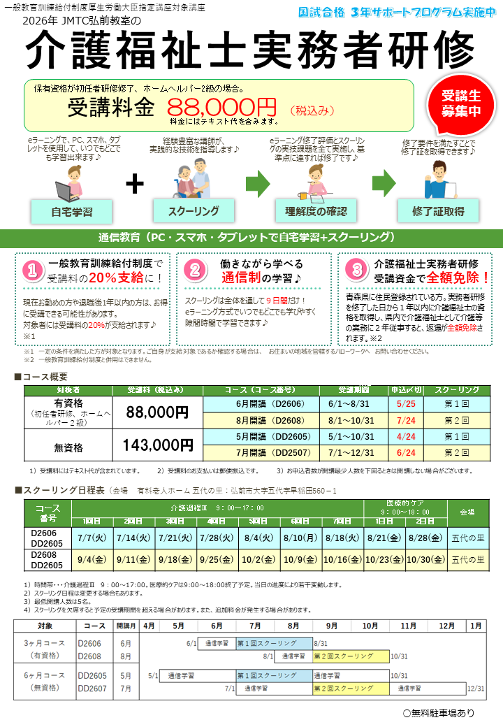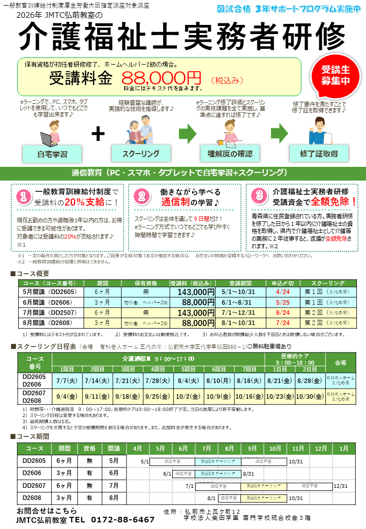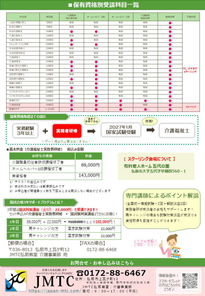 介護福祉士の受験資格として『実務者研修』の修了が必須となりました!JMTC弘前教室では2026年受講生を募集中です!